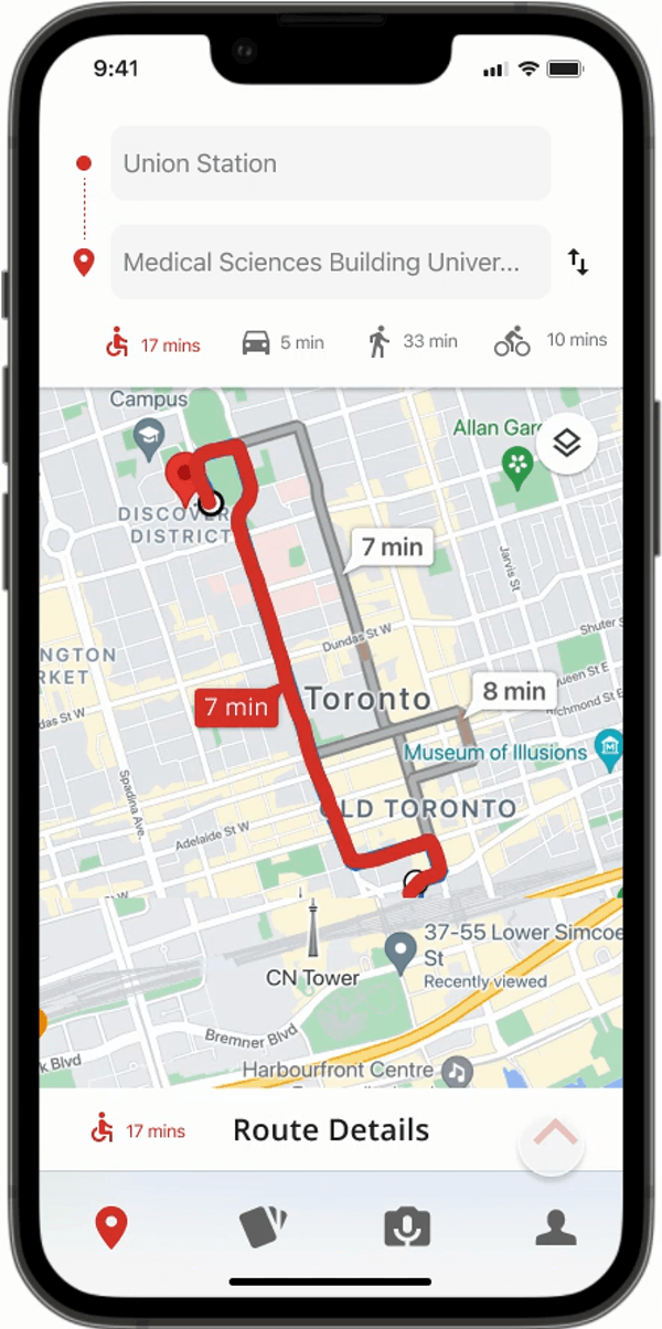 Deciding on the navigation came from thinking about the order of events the user would go through. For example, they would likely start with planning their trip, so they would first need to look up the route. Once they have an idea of where they need to go, they may have some questions/concerns about it, which is why they would go to the cards to get more information. Lastly, the AR/virtual assistance feature is most valuable once they actually start their journey.